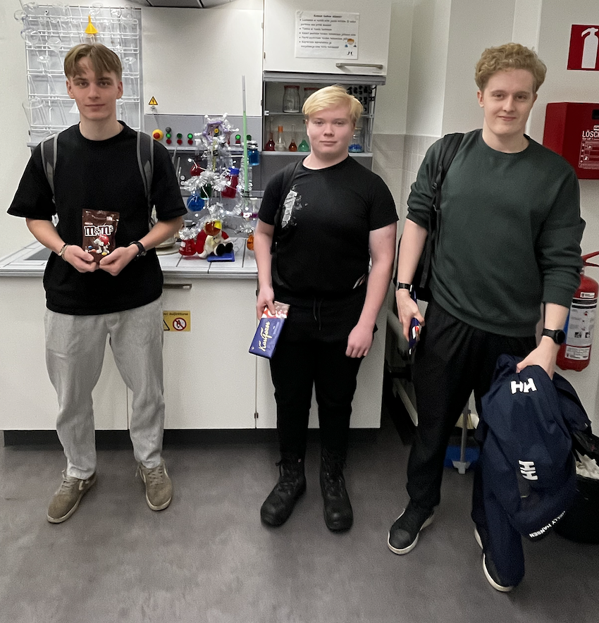 Joulukuussa oli myös pienimuotoinen lasku- ja arvauskilpailu kemian luokassa. Lähimmäs oikeita tuloksia pääsi Hannes Korhonen.