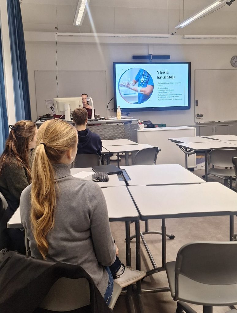 OP2-opintojakson oppitunneilla kuultiin viime viikolla opiskelijoiden raportteja työnvarjostuspäivistään. Kuvassa Venla Lehtovuori esittelee työnvarjostuspäiväänsä TYKSin infektiotautien poliklinikalla. Hän seurasi infektiolääkärin työtä ja sai osallistua myös potilastyöhön.