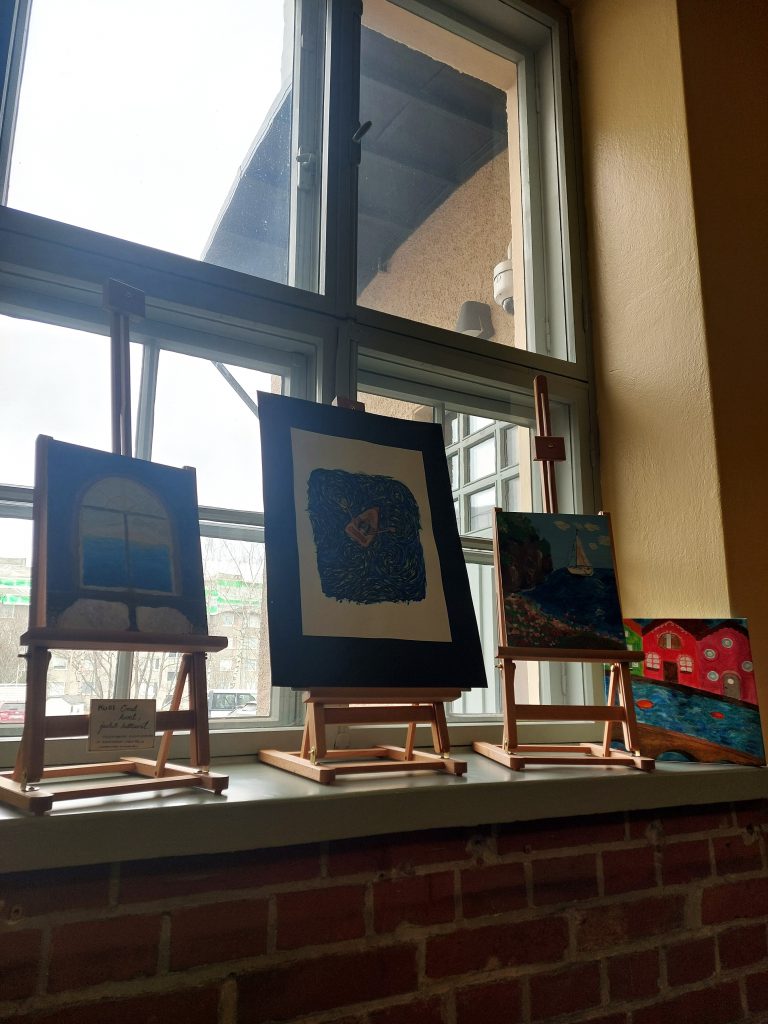 KU1-opintojakson näyttelyn ”Omat kuvat, jaetut kulttuurit” teoksia on esillä kuvataiteen ja musiikin luokan edustalla sekä luokassa. Sisältöinä opintojaksolla on mm. taidehistoriaa, kuvanlukutaitoa ja eri tekniikoiden harjoittelua.